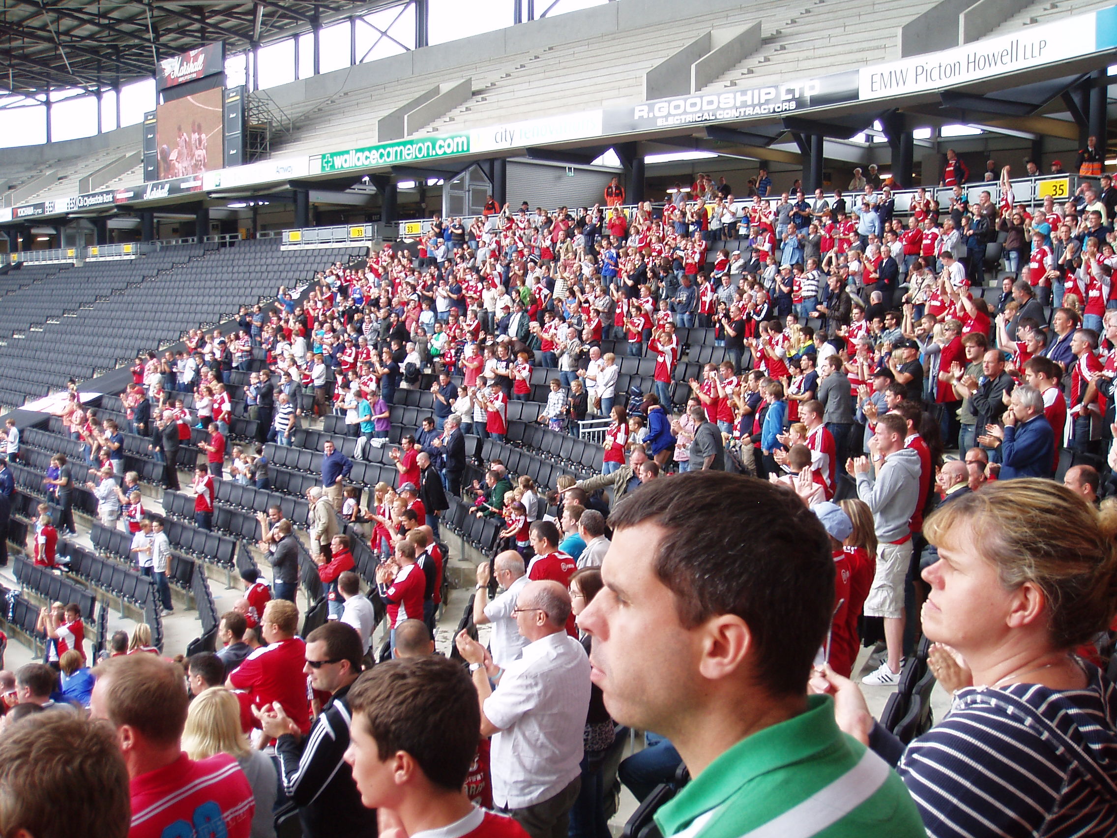 Being one of the recent wave of newly constructed stadiums, StadiumMK is isolated far out of town and anchor to a retail park. An unusually modern and un-British ground which has been left purposely half completed, with a reduced capacity at 22,000 which can be raised to 32,000 by adding seats to top tier. In its uncompleted form it perhaps represents a sign of our times.