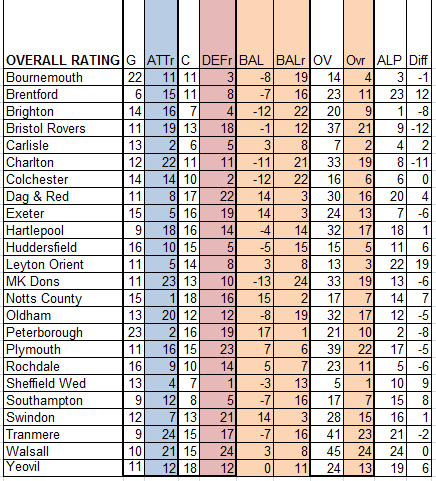 Balance, i.e. the difference between ATTr and DEFr, shows where the quality or priority of each team is. A higher positive BALr indicates a team is set up to put pressure on the opposition and are best at / prefer an attacking game and the inverse is applicable to a minus / low BALr where teams tend to sit behind the ball and are strongest in defence. An middle ranking figure such as the BALr of 13 given to Sheffield Wednesday indicates the team is equally strong in both attack and defence.