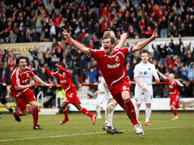 The following Saturday league leaders Norwich City came to Swindon expecting to increase their 7 point lead at the top. Town, so often the victim of a late goal, turned the tables with a late goal of our own to seal a more than deserved draw. As Gordon Greer got free of his marker and towered above to head into the net in the 92nd minute the County Ground went berserk. Definitely one of my moments of the year and this is one of my favourite images summing up the relief all round. Fantastic!
