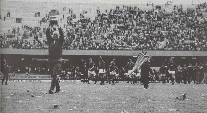 To compensate Swindon for being denied entry into the European Fairs Cup, an Anglo-Italian Cup Winners Cup was played. The matches against Roma – including a young Fabio Capello – in August and September 1969 gave a famous 5-2 aggregate win. The Associations were impressed with the competition format so this lead to the formation of the Anglo-Italian Cup, first played in May 1970. A double victory against Juventus and 1-0 win away to Napoli, sent Swindon to Naples for the final. At 3-0 up a riot by Napoli supporters disgusted at their team’s performance led to the match being abandoned and the cup award to Swindon. Leaving us with the iconic image of Fred parading the trophy around the irate San Paolo. Yet Fred’s European adventures aren’t counted in this assessment.