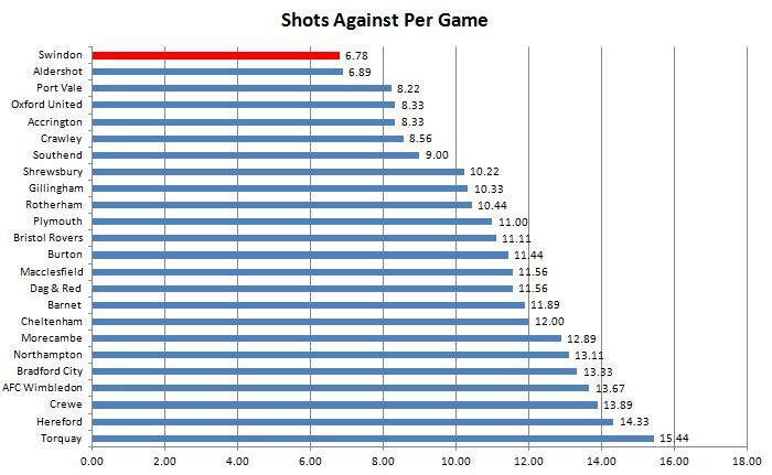 Organising the defence to restrict the number of opposition shots is clearly something Paolo Di Canio has massively improved. After nine games Swindon have the lowest average number of shots against in League Two at 6.78 per game, just ahead of Aldershot, and significantly ahead of Torquay, who’s porous defence allows an average of 15.44 shots against per game. However, as we’ll see, the Swindon defence minimising shots against is only effective if your keeper can save the limited ones they face.