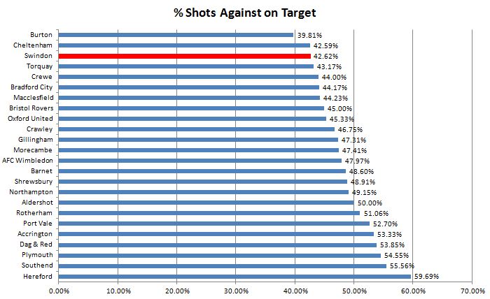 The total number of shots against is only part of the measure. The effectiveness of your defence to close down the opposition to reduce the number of shots on target is perhaps a clearer measure of defensive success. Again Swindon score very highly, third with 42.62% of opponent shots on target, compared to Hereford United allowing 59.7% of their shots against on target. Interestingly while Torquay allow a high number of shots against them, a very low percentage of 43.17% actually test the keeper.