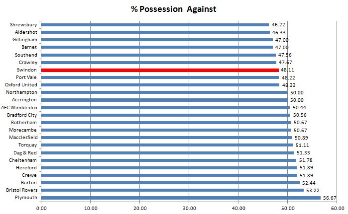 In restricting our opposition to an average of 48.1% possession Swindon haven’t really dominated games this season, falling within a top group of 9 clubs who control more than 50% of their matches so far. Of these 9 sides, only 3 are currently in the top 7, but 6 of the 9 are within the top half of the League table.