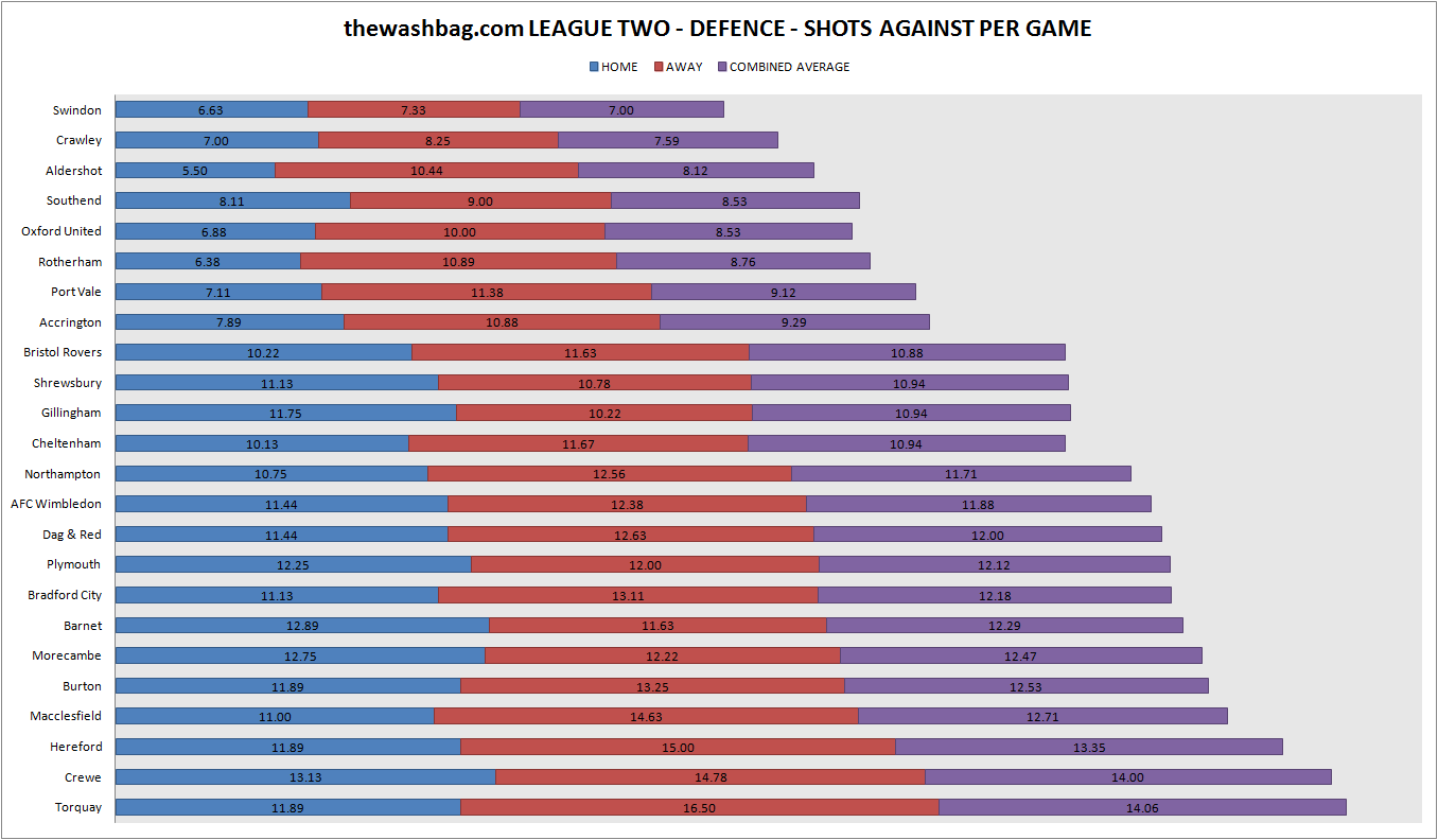 Aldershot have the lowest of any team with 5.5 shots against at The Recreation Ground, however it all falls away on their travels with their opponents allowed to create nearly double the chances at their goal.