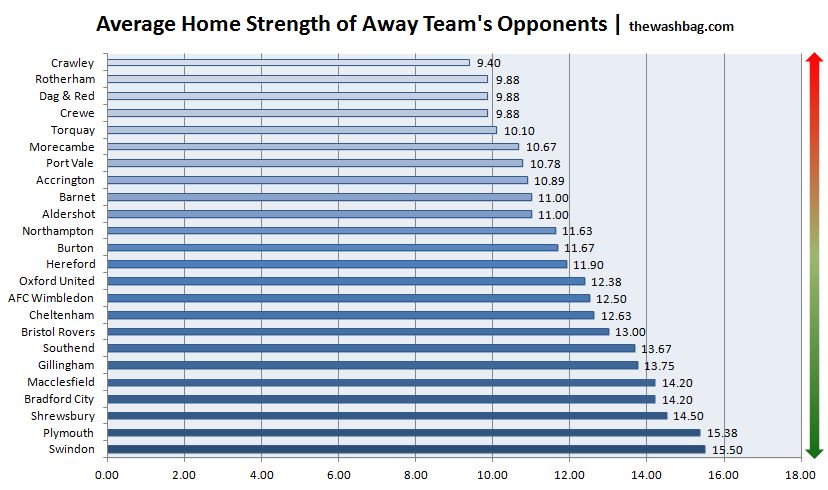 Crawley are to face a very tough standard of opponent on their travels with an average position of 9.4. Their trips to Swindon, Shrewsbury, Gillingham and Accrington will present the greatest threat to their promotion hopes.