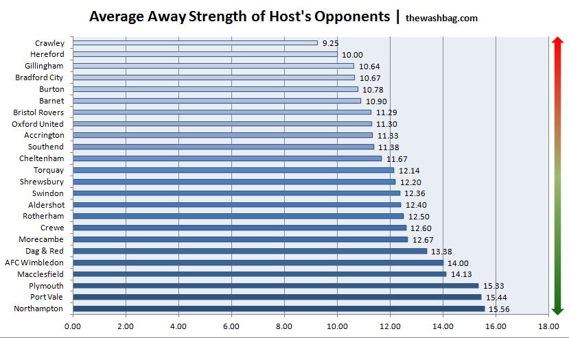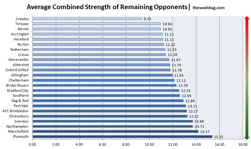 With two of the four toughest opponents to face, Crawley and Torquay could well be the teams to fall out of the automatic promotion race. Both sides have picked up a good 1.6 points per game on their travels to date, however with tough trips to the County Ground and Priestfield (for both), Whaddon Rd for Torquay, and the New Meadow and Roots Hall for Crawley, these two are looking the likely candidates to drop points given the difficulty of the fixtures.