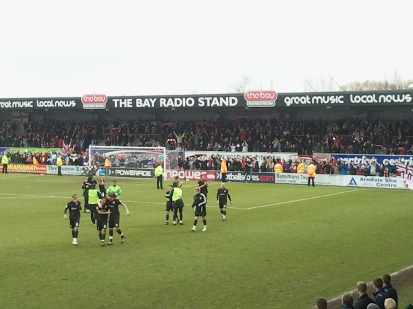 Ground: Smart but titchy, with nothing more than a step all along one side of the pitch. Naming it The Globe ‘Arena’ was pushing it a bit. Mind you, it was a reminder that many of the clubs in this League operate on a very different budget to Swindon’s. The Morecambe fans seemed a nice bunch, and the away end had a nice low roof to help the Town fans make a racket.