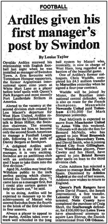 Let’s step back to the start of that season – it’s the summer of 1989 and shrill scouser Sonia was riding high in the UK charts with the bubbly, yet faintly aggressive sounding “You’ll Never Stop Me From Loving You!” On the field it was a summer of flux as Lou Macari buggered off to West Ham United and Swindon promptly replaced him with another famous, untried manager in one Osvaldo César Ardiles.