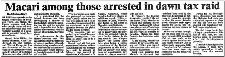 Town soldier on but just before the last game of the season another blow hits the club when Hillier, Macari, Colin Calderwood and Secretary Vince Farrar are arrested and questioned by the Inland Revenue concerning charges of tax fraud. Calderwood is released without charge, the others are given bail.