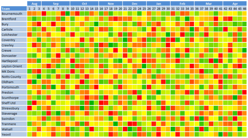 Statistical master and Torquay United supporter Ben Mayhew has created an algorithm to rank each team’s fixture list for the Championship, Leagues One and Two by their difficulty and visualised the results into a helpful heat map.