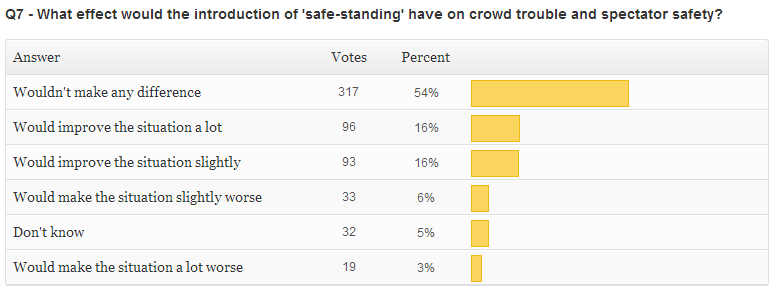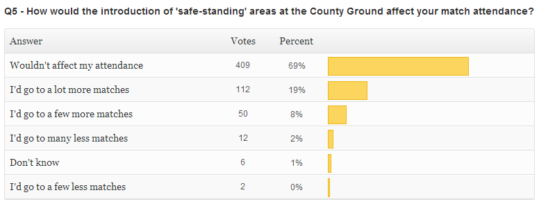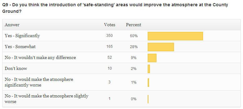 With all-seater stadiums derided as a key factor for the lack of atmosphere at Football League grounds, Question 9 asked whether safe-standing would improve the atmosphere at the County Ground.