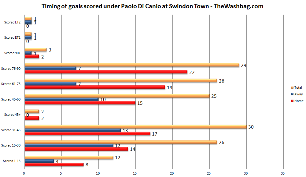 22% of all goals scored as hosts came in the final 15 minutes compared to 8% in the opening 15, proving Di Canio’s Swindon grew stronger at the County Ground as the match progressed over the ninety minutes.