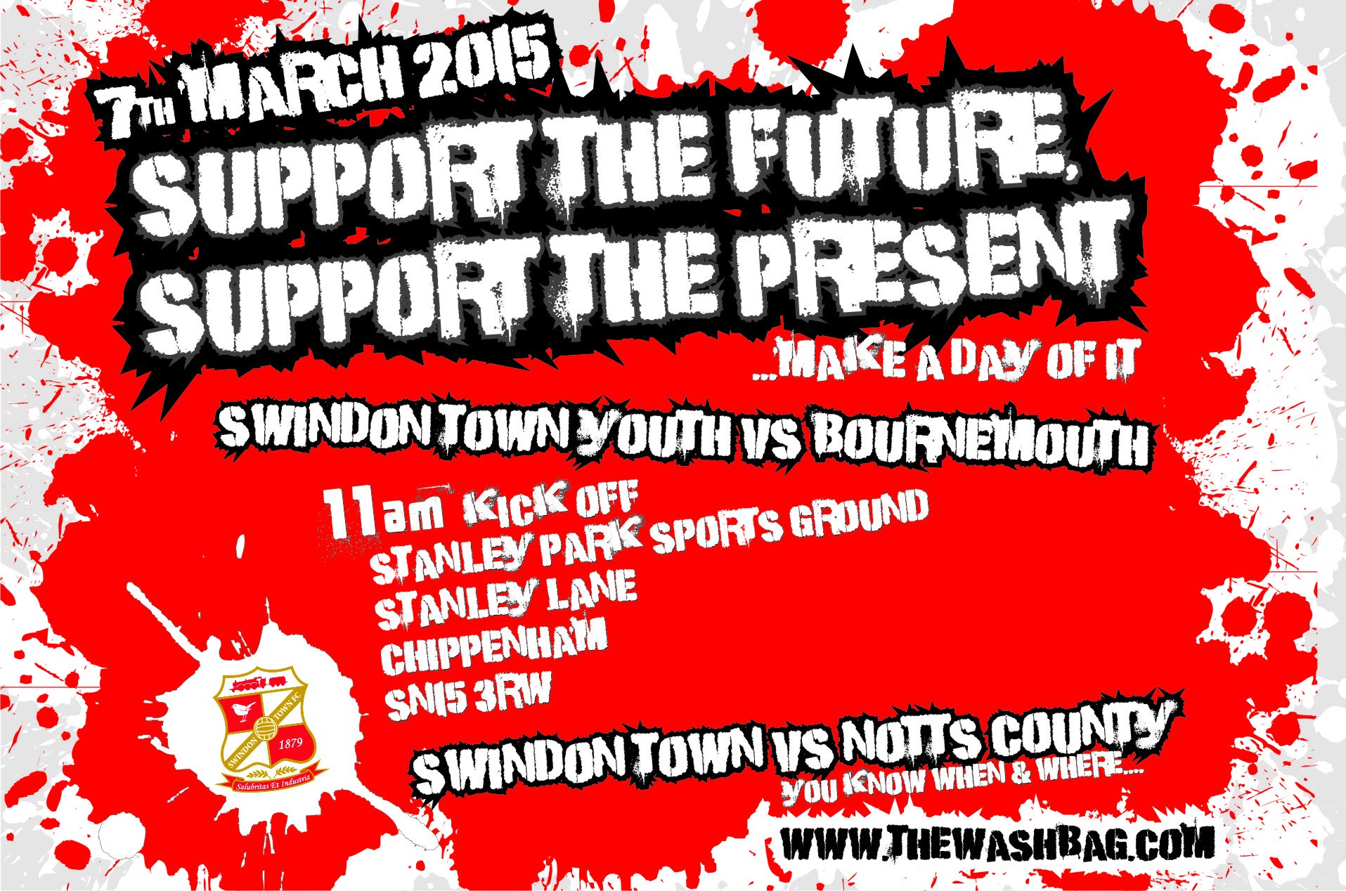 JOIN US on Saturday 7th March as we ‘Support the Future, Support the Present’. We travel to watch Swindon Town u18s vs AFC Bournemouth u18s @ 11am Stanley Park Sports Ground at Chippenham, followed by Swindon Town vs Notts County @ 3pm at the County Ground…