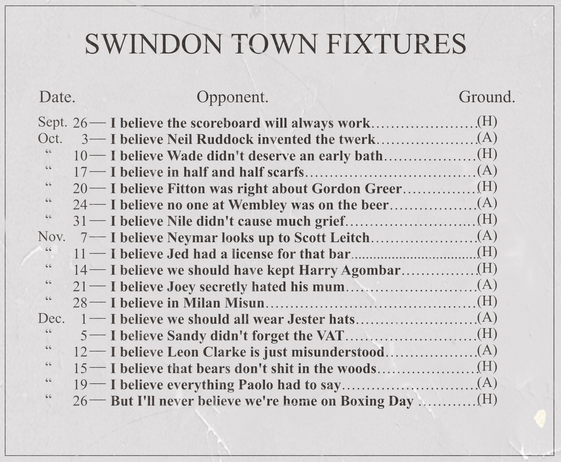 The ballad of Boxing Day Posted on June 17, 2015 by TheWashbag Leave a comment A poem following the release of the 2015/16 League One fixtures – by Matt Arnold… Image by Brendan Hobbs Rate this:Share this:Tweet Click to print (Opens in new window) Print Click to email a link to a friend (Opens in new window) Email MorePocket Click to share on Reddit (Opens in new window) Reddit Share on TumblrLike Loading... Related tagged with 2015/16 League One, Fixtures, Football, Swindon Town, Writer - Matt Arnold Blog