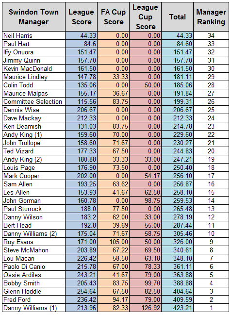 With a score of 256, Mark Cooper is ranked as the 17th greatest Swindon Town manager in our countdown – between Louis Page and Sam Allen – in a middle-ranking position in the 34 managers.