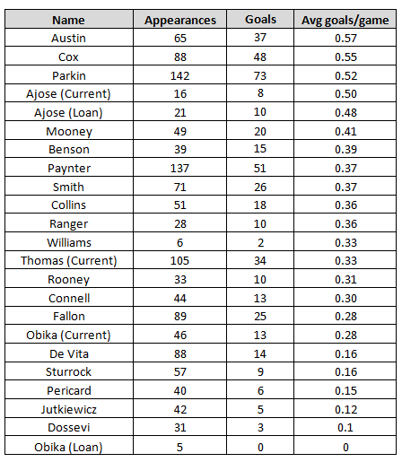 Several weeks and a managerial change later, it’s right to assess Ajose’s impact at the County Ground. The early signs are that Nicky can be as good as some of the most prolific strikers for Swindon in the past decade as he’s natural a finisher. While direct comparisons with Austin, Cox, Parkin etc are difficult, the crucial statistics are goals and a goals per game contribution…