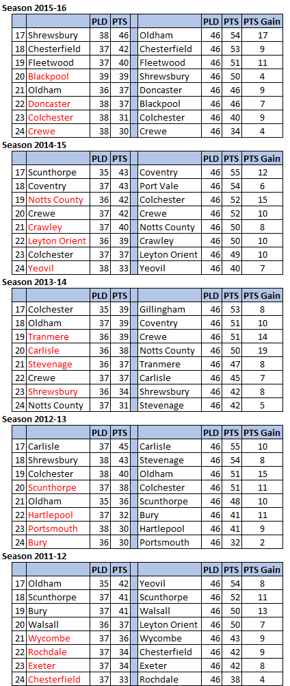 Unfortunately, in the past five seasons, as the below charts show, a side with 37 points or fewer (on matchday 37) has saved themselves from relegation on just five occasions – Oldham Athletic in 2015/16, Colchester United in 2014/15, Notts County and Crewe Alexandra in 2013/14 and Oldham Athletic in 2012/13.